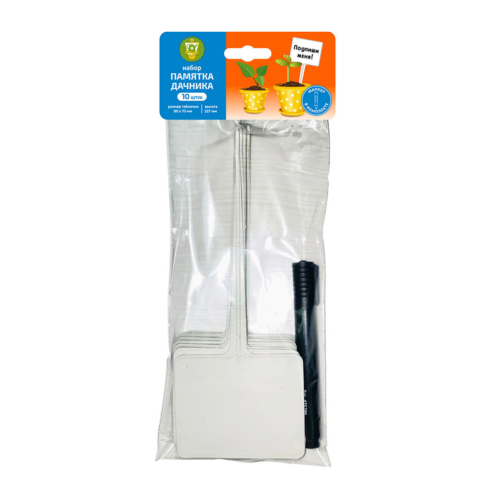 Таблички предназначены для указания названия культуры и даты посадки. Перманентный маркер в комплекте. Сделанная маркером надпись не выгорит на солнце и не смоется водой. Для повторного нанесения надписи необходимо протереть табличку тканью, смоченной спиртовым раствором.