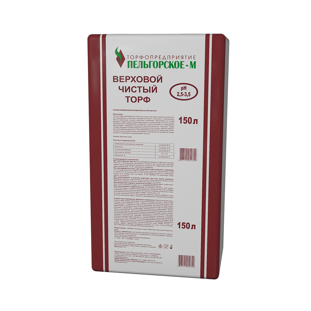 Чистый торф используется в открытом и защищенном грунте (теплицах) в агропромышленных комплексах, личных подсобных хозяйствах. Приготовлен на основе верхового торфа низкой степени разложения с последующей очисткой от крупных включений и разделением на фракции. Технология добычи и переработки обеспечивает сохранение природной длинноволокнистой структуры торфа. Готовая продукция характеризуется однородностью состава, хорошей аэрацией и большой влагоемкостью. Рекомендован для выращивания растений-кислятников, которым для роста и развития необходима кислая реакция среды ( брусничные, вересковые, голубика, клюква). Состав — верховой торф.
