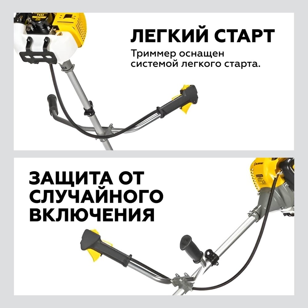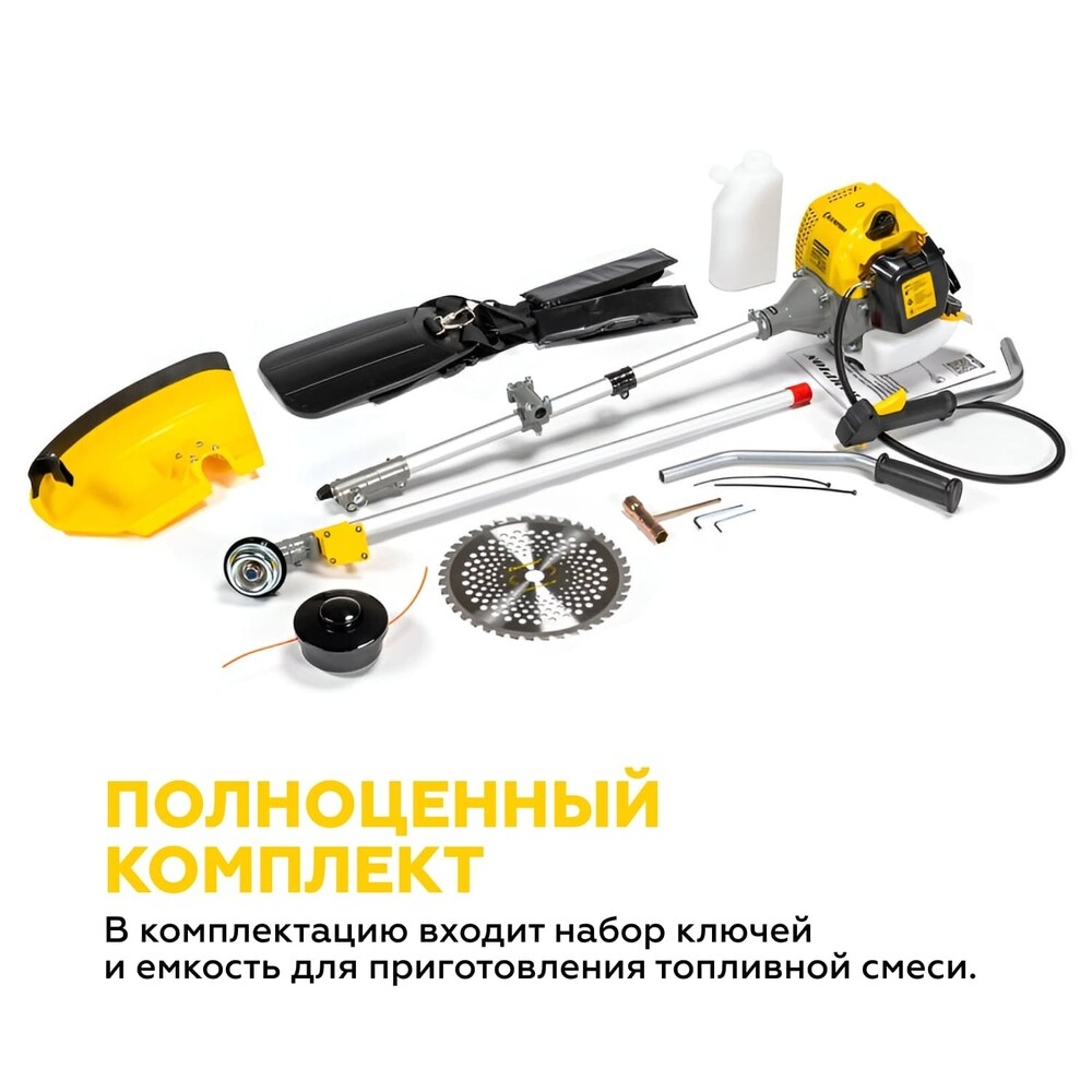 Нож – 1 шт., Триммерная головка – 1 шт., Ремень – 1 шт., Кожух защитный – 1 шт., Инструкция – 1 шт., Емкость для топлива – 1 шт., Ключ свечной – 1 шт.