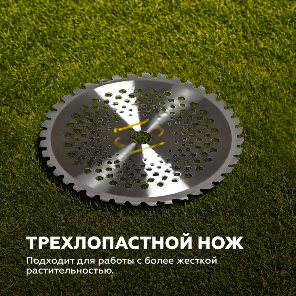 Предназначен для кошения газонов и лужаек. Укомплектован двумя режущими оснастками: ножом и триммерной головкой. Разборный вал облегчает перевозку и хранение инструмента.