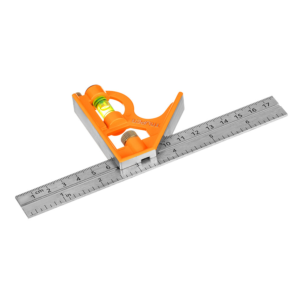 Встроенный уровень, чертилка, углы 90 и 45, полотно из нержавеющей стали с гравировкой метрической и дюймовой шкалы, корпус из алюминия.