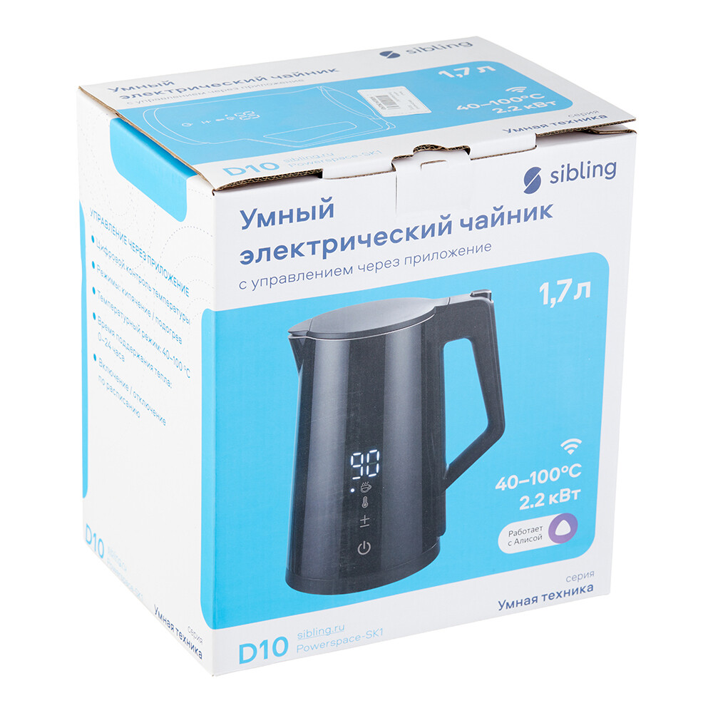 Предназначен для кипячения и подогрева воды. В чайнике предусмотрено 7 режимов с различной температурой нагрева, подходящей для приготовления разнообразных напитков. Управлять чайником можно через приложение Sibling Smart Home или голосовым помощником Алиса. Благодаря сенсорному дисплею, легко контролировать температуру воды, а поддерживать тепло можно в течение 12 часов. Внутренний слой чайника из нержавеющей стали. Вода не вступает в контакт с пластиком, а корпус не обжигает руки. В целях безопасности, электрический чайник Sibling автоматически отключается при отсутствии воды и при снятии с подставки.