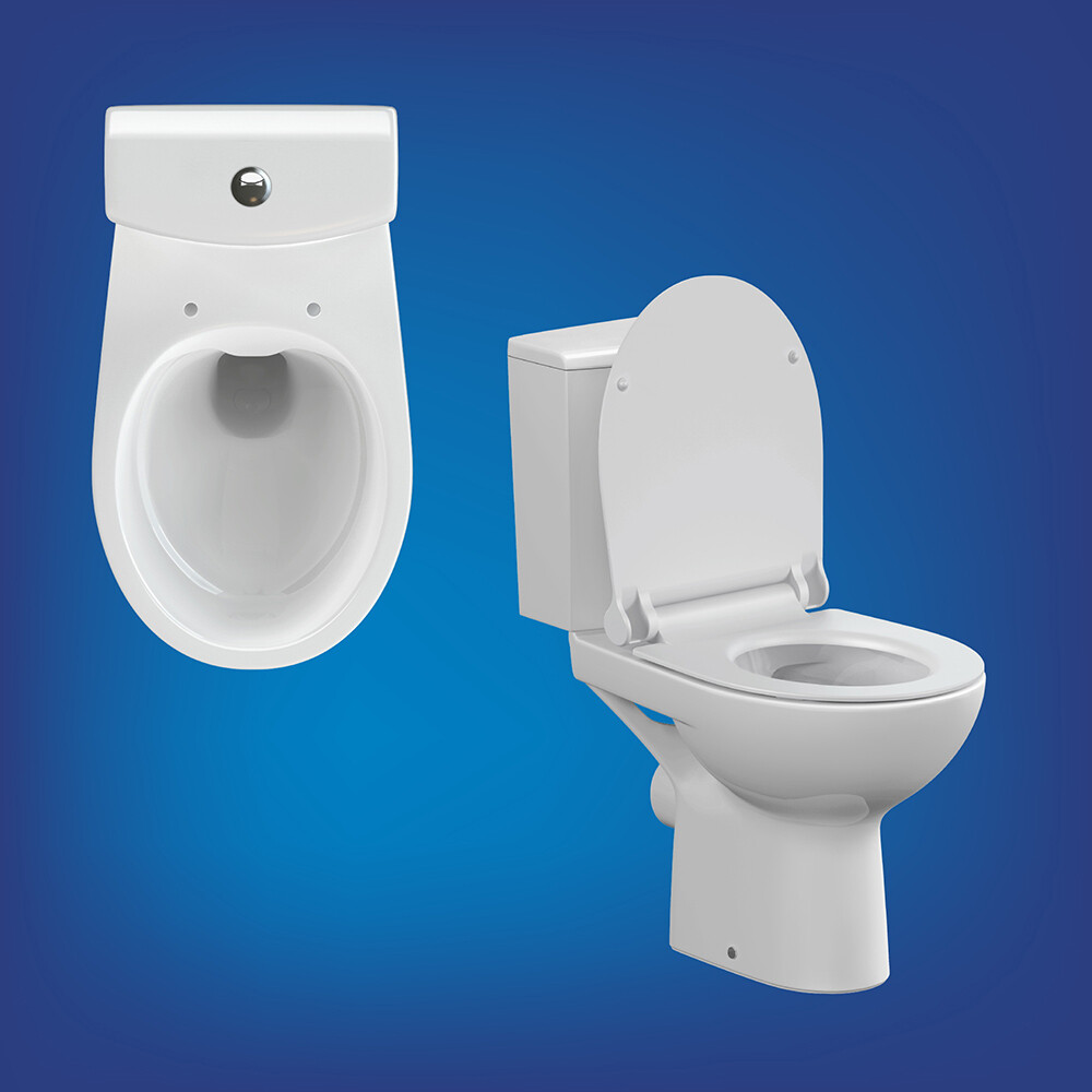 Безободковый напольный унитаз-компакт с антибактериальным сиденьем с плавным закрыванием и легкосъемным механизмом. Двухуровневая арматура с механизмом смыва Siamp 3/5л.