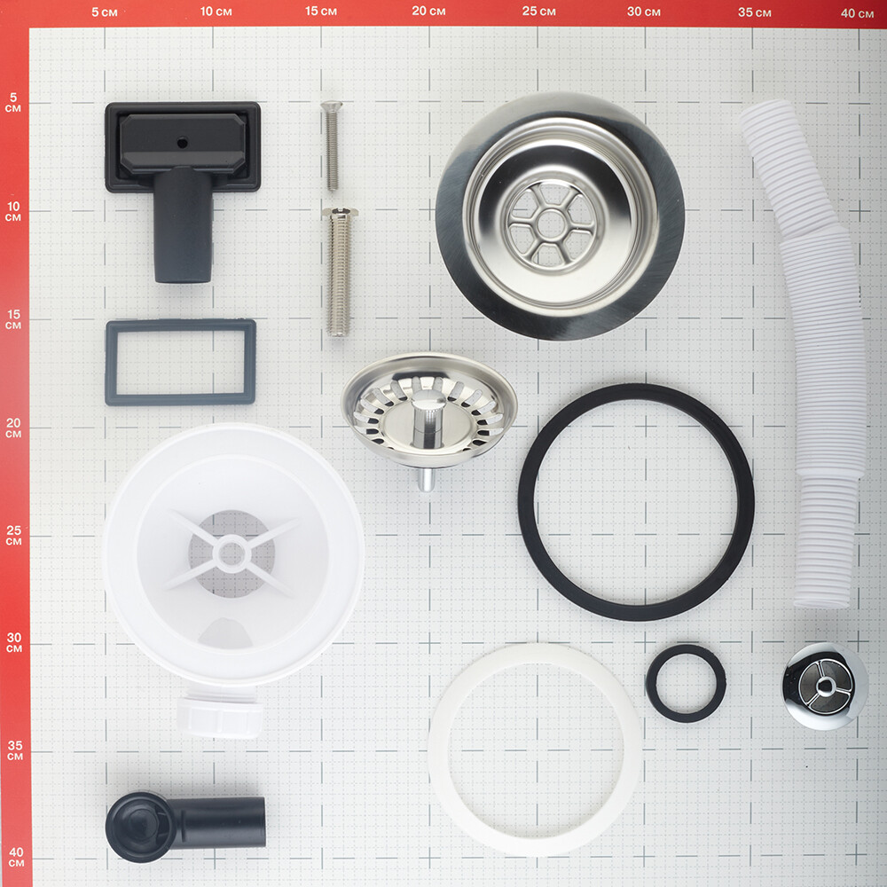 Комплектация: Слив, гофра, перелив (круглый и прямоугольный), решетка-пробка.