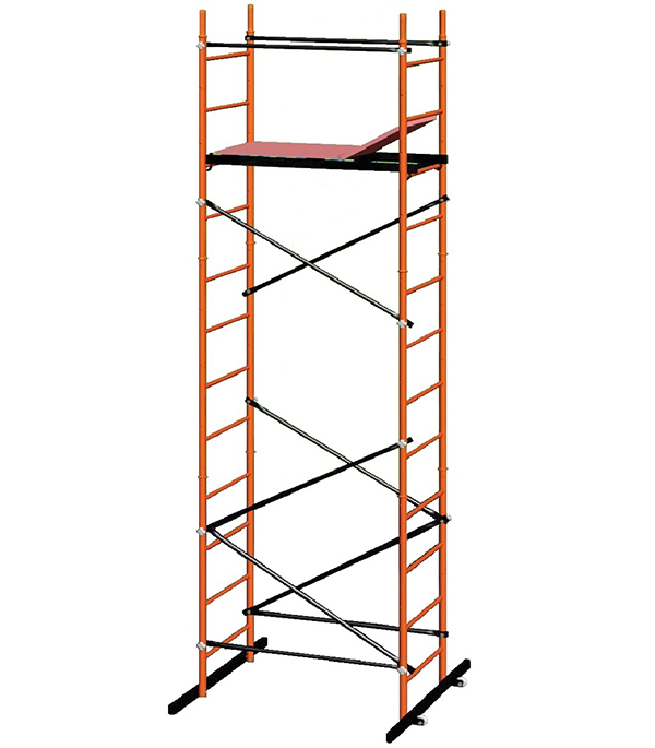 Комплектация: Балка опорная — 2 шт., лестница вертикальная (1,4 х 0,7 м) — 6 шт., горизонтальная стяжка — 4 шт., диагональная стяжка — 6 шт., колеса простые — 2 шт., настил с люком — 1 шт., крепеж.
