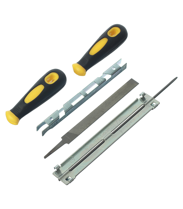 Комплектация: пластиковая рукоятка для круглого напильника, пластиковая рукоятка для плоского напильника, комбинированный шаблон, круглый напильник диаметром 4 мм, плоский напильник.