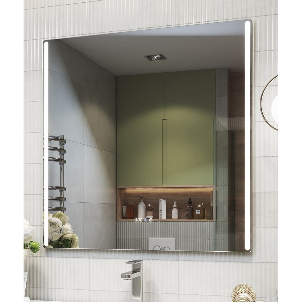Зеркало имеет сенсорное управление, светодиодную подсветку, часы, а также функцию антизапотевания. Питание осуществляется от сети.
