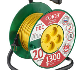 Первоначальная цена составляла 4423 ₽.4423 ₽Текущая цена: 4423 ₽.шт.Удлинитель Союз без заземления 20 м на катушке 1,3 кВт 4 розетки ПВС (ТУ) 2х0,75 кв.мм IP20