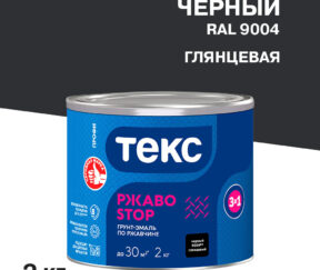 Первоначальная цена составляла 2270 ₽.2270 ₽Текущая цена: 2270 ₽.шт.Грунт-эмаль по ржавчине 3в1 Текс РжавоStop черная глянцевая 2 кг
