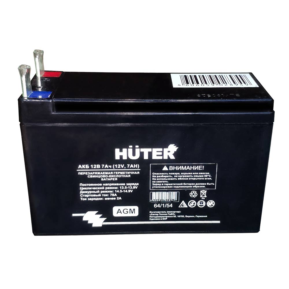Аккумуляторные батареи свинцово-кислотные, герметичные. Предназначены для запуска бензиновых электрогенераторов, оснащённых электрическим стартером. Могут применяться так же и для другой бензиновой техники со схожими техническими параметрами. Аккумуляторы HUTER изготовлены при помощи технологии AGM (Absorbent Glass Mat).