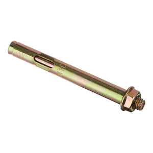 Оцинкованное покрытие обеспечит защиту от коррозии. Анкерный болт с гайкой (втулочный анкер) оснащен фиксирующей гильзой, длина которой равна размерам стального стержня. На хвостовой части шпильки выполнена клинообразная головка. При завинчивании гайки она смещается по резьбовой части. В результате перемещения происходит распирание втулки. Конструктивные особенности такого вида крепежа позволяют использовать его в легких видах бетонов с ячеистой структурой, а также в кирпиче, изготовленном из обожженной глины.