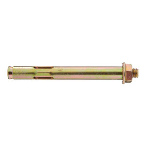 Оцинкованное покрытие обеспечит защиту от коррозии. Анкерный болт с гайкой (втулочный анкер) оснащен фиксирующей гильзой, длина которой равна размерам стального стержня. На хвостовой части шпильки выполнена клинообразная головка. При завинчивании гайки она смещается по резьбовой части. В результате перемещения происходит распирание втулки. Конструктивные особенности такого вида крепежа позволяют использовать его в легких видах бетонов с ячеистой структурой, а также в кирпиче, изготовленном из обожженной глины.
