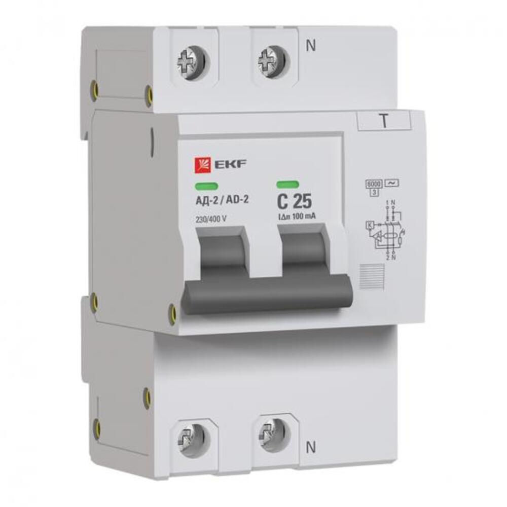 Автомат дифференциальный EKF PROxima АД-2 25А 1P+N тип AC 100 мА 6 кА (DA2-6-25-100-pro)