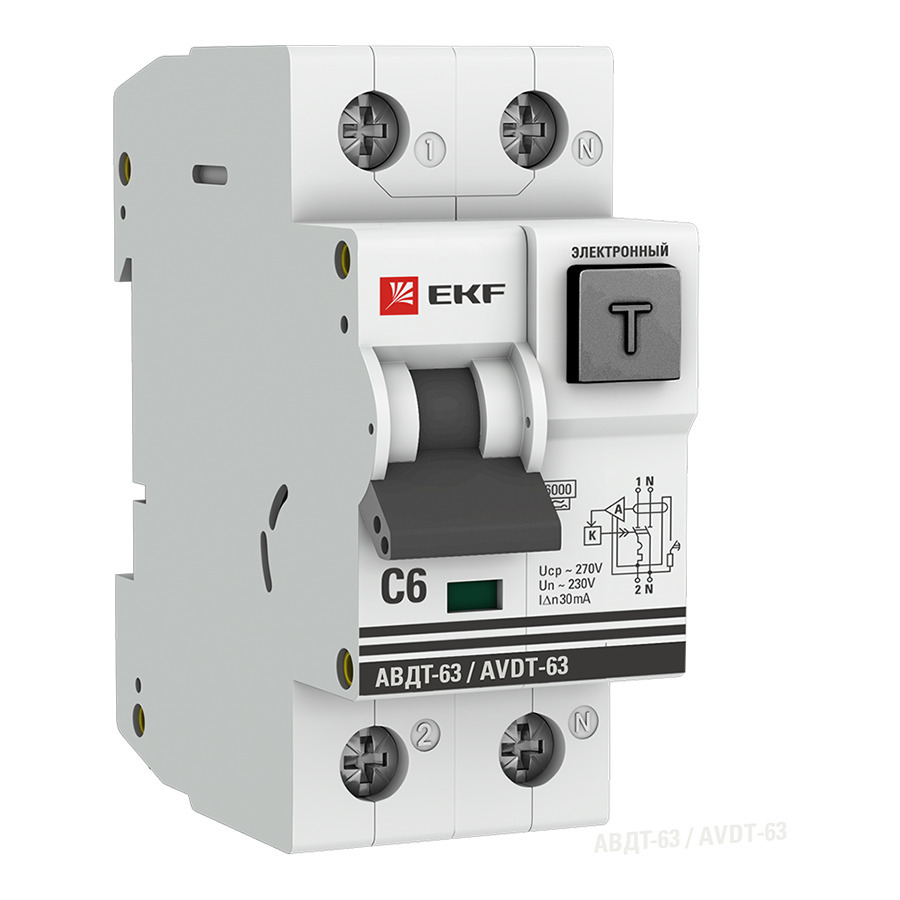 Представляет собой аппарат, сочетающий функции автоматического выключателя с электромеханическим или электронным УЗО. При обнаружении автоматическим выключателем в защищаемом участке сети тока утечки (повреждения) на землю или сверхтока (тока перегрузки или короткого замыкания) происходит срабатывание устройства, приводящее к отключению защищаемой сети. Возможна коммутация алюминиевым и медным проводником. Автоматический выключатель дифференциального тока малогабаритный АВДТ-63М EKF PROxima представляет аппарат, сочетающий функции автоматического выключателя с электронным УЗО типа АС в компактном корпусе шириной один модуль. При обнаружении автоматическим выключателем на защищаемом участке сети тока утечки (повреждения) на землю или сверхтока (тока перегрузки или короткого замыкания) происходит срабатывание устройства, приводящее к отключению защищаемой сети. Особое отличие дифференциальных автоматических выключателей EKF с электронным УЗО – в наличии блока защиты от перенапряжения. Возможна коммутация алюминиевым и медным проводом.