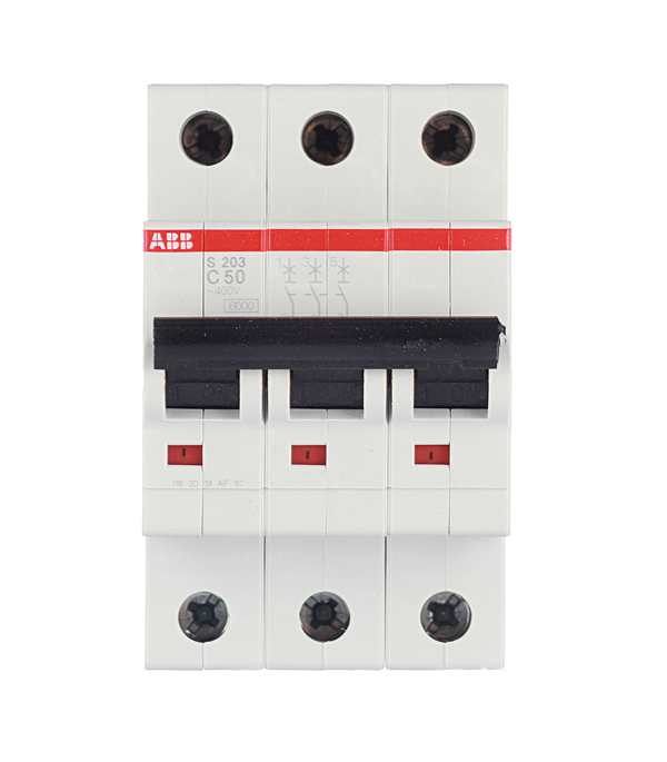 Расшифровка маркировки: 3Р — трехполюсной (используется в трехфазных сетях), 50А — величина номинального тока в амперах (ток, который автомат способен пропускать долгое время без отключения цепи), тип С — автомат срабатывает при токе в цепи в 5-10 раз больше номинального и применяется для защиты цепей розеток и освещения, 6кА — рабочая отключающая способность в килоамперах, АВВ — фирма производитель, S200 — серия автоматов.