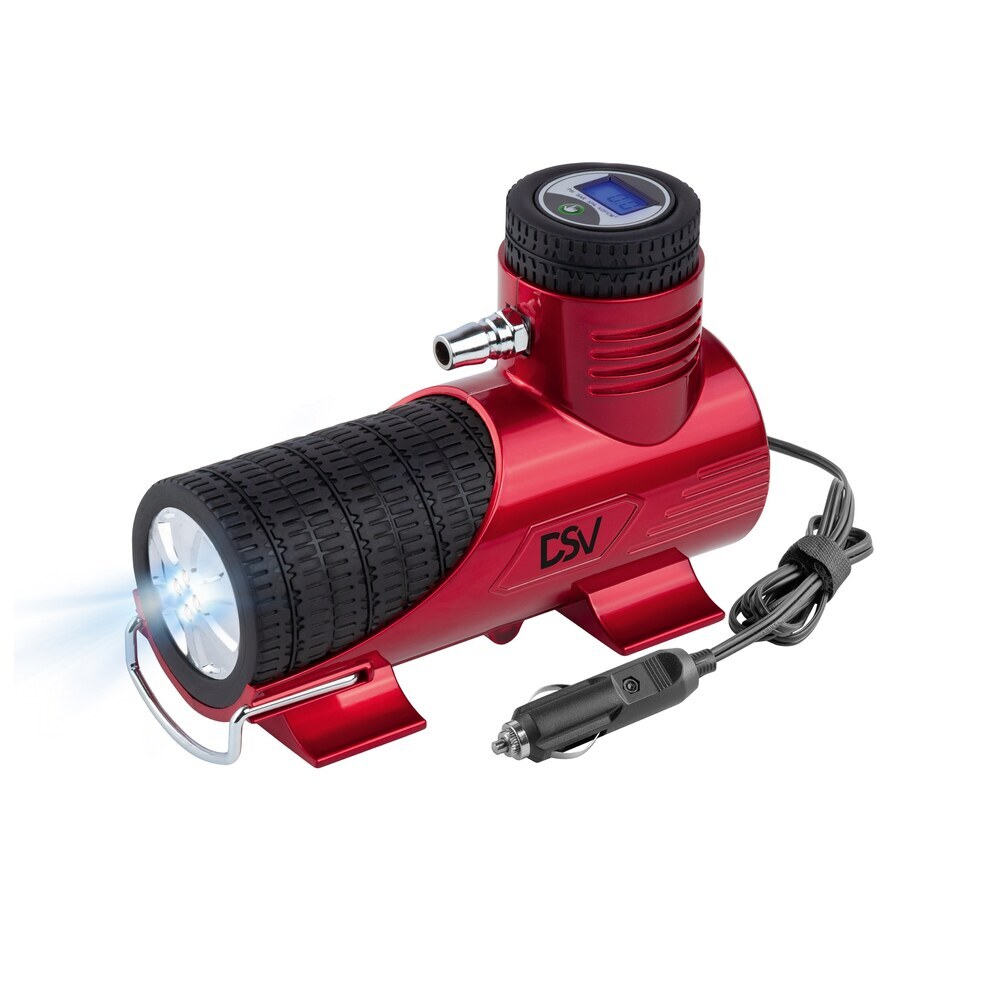 Цифровой компрессор с автостопом DSV, оснащенный: LED фонарем, набором переходных штуцеров, может использоваться для накачивания шин автомобилей и другого транспорта, различных надувных изделий, спортивного инвентаря. Производительность 35 л/мин обеспечивает комфортную скорость накачивания.