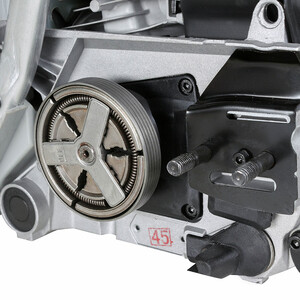 Модель оснащена карбюраторным двигателем на 3,1 л.с, объемом 45 см3. Мотор работает на смеси бензина и масла для двухтактных двигателей. Используется топливный фильтр повышенной фильтрации. Емкость топливного бака — 550 мл.