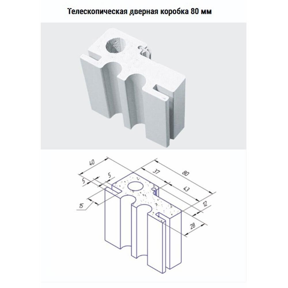 Дверное полотно глухое. Элементы несущего каркаса – влагостойкий LVL брус. Наполнитель – пенополистирол экструзионный. Кромочная ПВХ лента 1,5 мм. Облицовочный ПВХ лист 1,5 мм, окрашенный в массе. Вставка под механизм замка из ДПК бруса. Телескопическая дверная коробка из экструдированного ПВХ. Уплотнитель. Размер фрезеровки – 195х18х73 (ВхШхГ), межосевое расстояние – 85 мм.