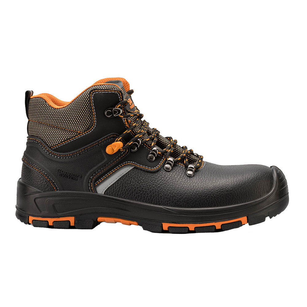 Ботинки Orange Profi предназначены для эксплуатации в помещениях и сезонной носке на открытом воздухе. Верх обуви комбинированный – союзка, нижняя часть берца и задинка из натуральной кожи, язычок, полуглухой клапан и верхняя часть берца — из прочного текстиля. Вставка из ТПУ в пяточной части, обеспечивает дополнительную прочность, фиксацию и поддержку стопы. На берцах и заднике используются светоотражающие элементы. Подкладка трикотажная, с отличными гигиеническими свойствами. Вкладная стелька съемная, анатомическая. Мягкий кант, полуглухой клапан и мягкий язычок обеспечивают хорошее прилегание и защиту от попадания посторонних предметов внутрь обуви. В обуви применена система быстрой шнуровки. Для защиты от ударов в носочной части установлен композитный подносок (200 Дж). Защиту стопы от проколов обеспечивает кевларовая стелька (1200Н). Подошва двухслойная ПУ/ТПУ, устойчивая к воздействию химических факторов, обладающая высокой прочностью и износостойкостью, отличными амортизирующими свойствами.