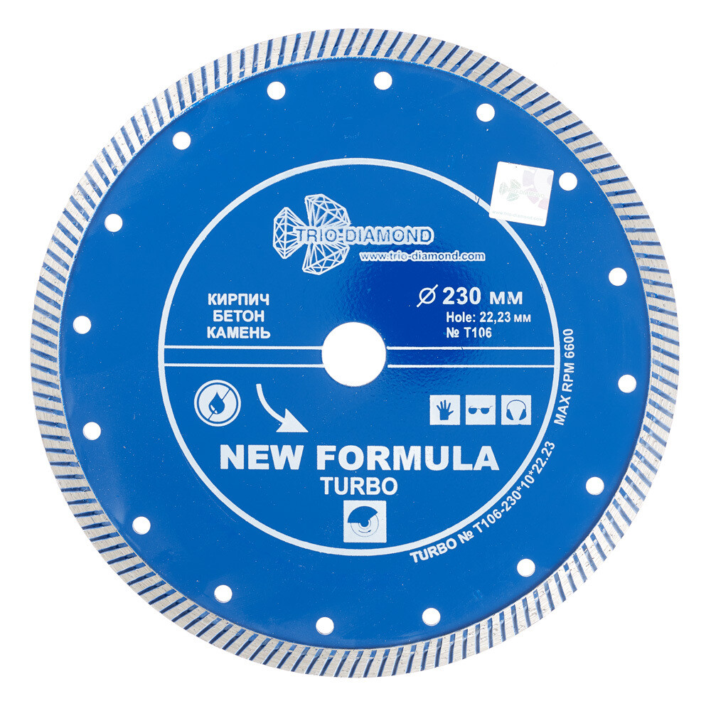 Алмазный отрезной диск Trio-Diamond New Formula Turbo T106 диаметром 230 мм предназначен для резки твердых и среднеабразивных материалов, таких как бетон, бордюрный камень, кирпич, тротуарная плитка, твердый песчаник, гранит и других неармированных материалов.