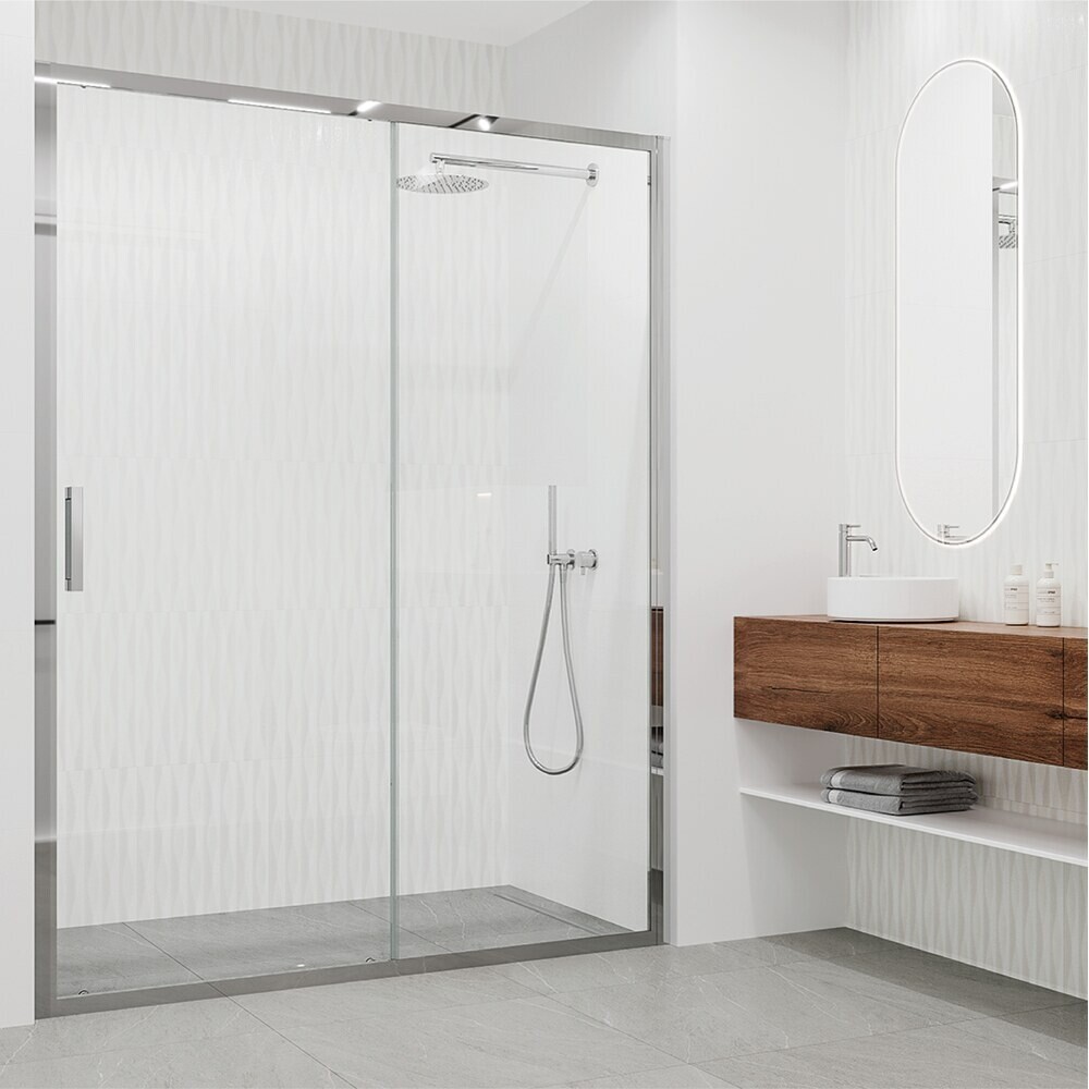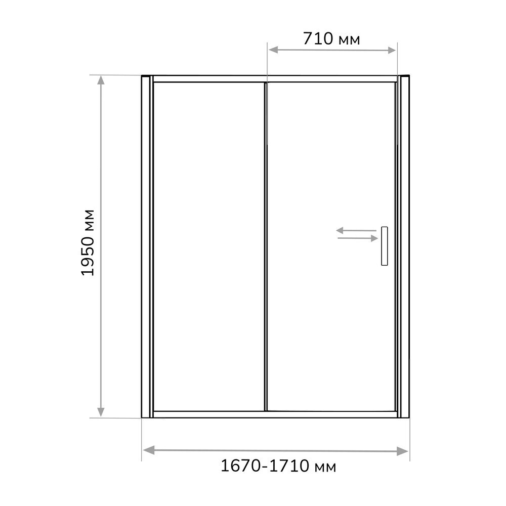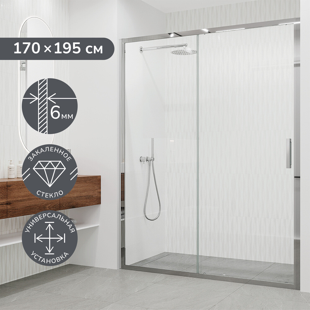 Душевая дверь для оборудования ванных комнат имеет закаленное прозрачное стекло толщиной 6 мм, которое травмобезопасно, выдерживает высокие перепады температур и устойчиво к механическому воздействию. Анодированный алюминиевый профиль 38 мм — защита от коррозии. Регулировка ширины двери от 1670 до 1710 мм позволяет компенсировать неровности стен и настроить размер душевой двери под ваш проем. Ролики с металлическим корпусом обеспечивают плавность хода двери и рассчитаны минимум на 30 000 циклов открывания. Уплотнители из ПВХ защитят пространство от брызг. Благодаря магнитному замку створка герметично закрывается. Хромоникелевое покрытие устойчиво к потускнению, отслаиванию и выцветанию. Поддон в комплект не входит. Возможна установка как на поддон, так и непосредственно на пол.