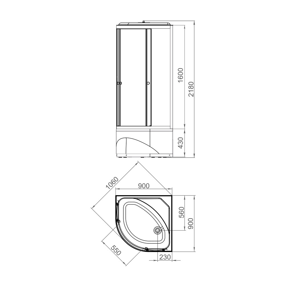 Поддон акриловый в комплекте с каркасом и экраном, комплект стекол, комплект стенок, крыша, верхний тропический душ, ручная лейка, держатель ручной лейки с регулировкой наклона, смеситель с металлическим ручками, полочка для мыльных принадлеж…