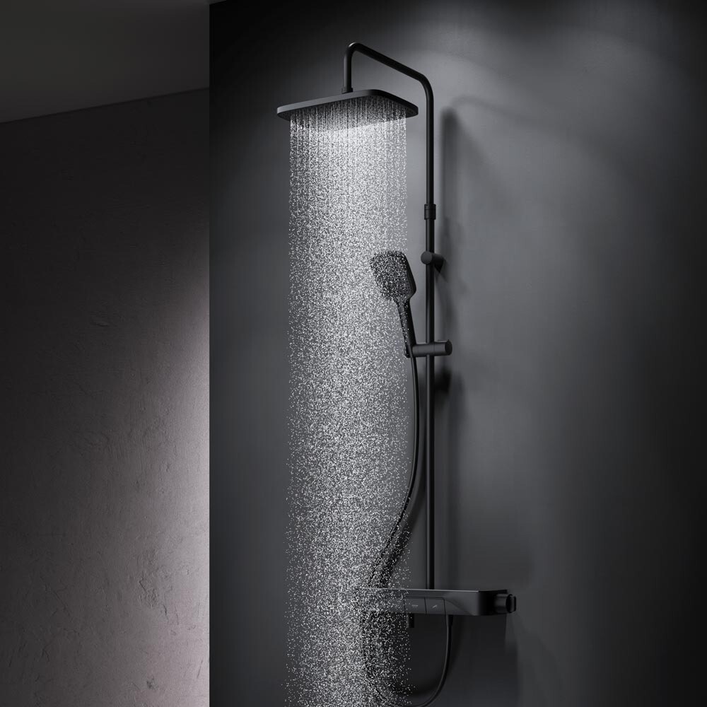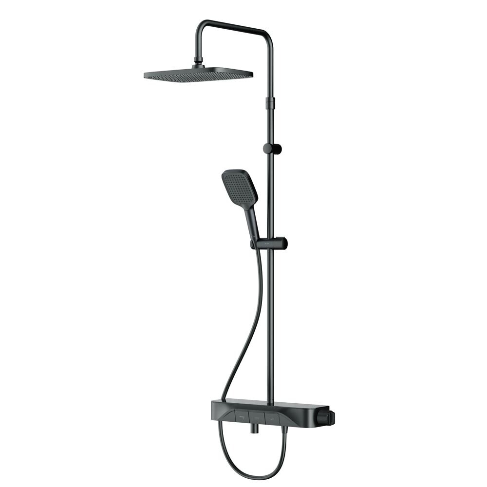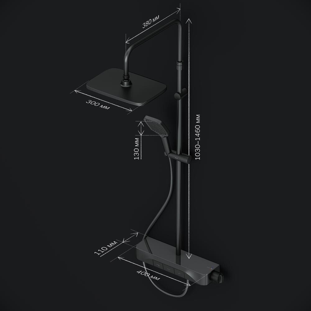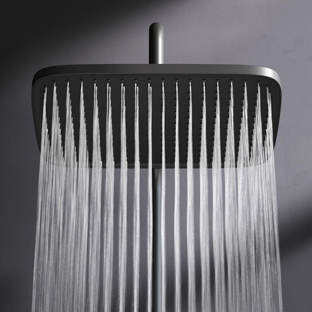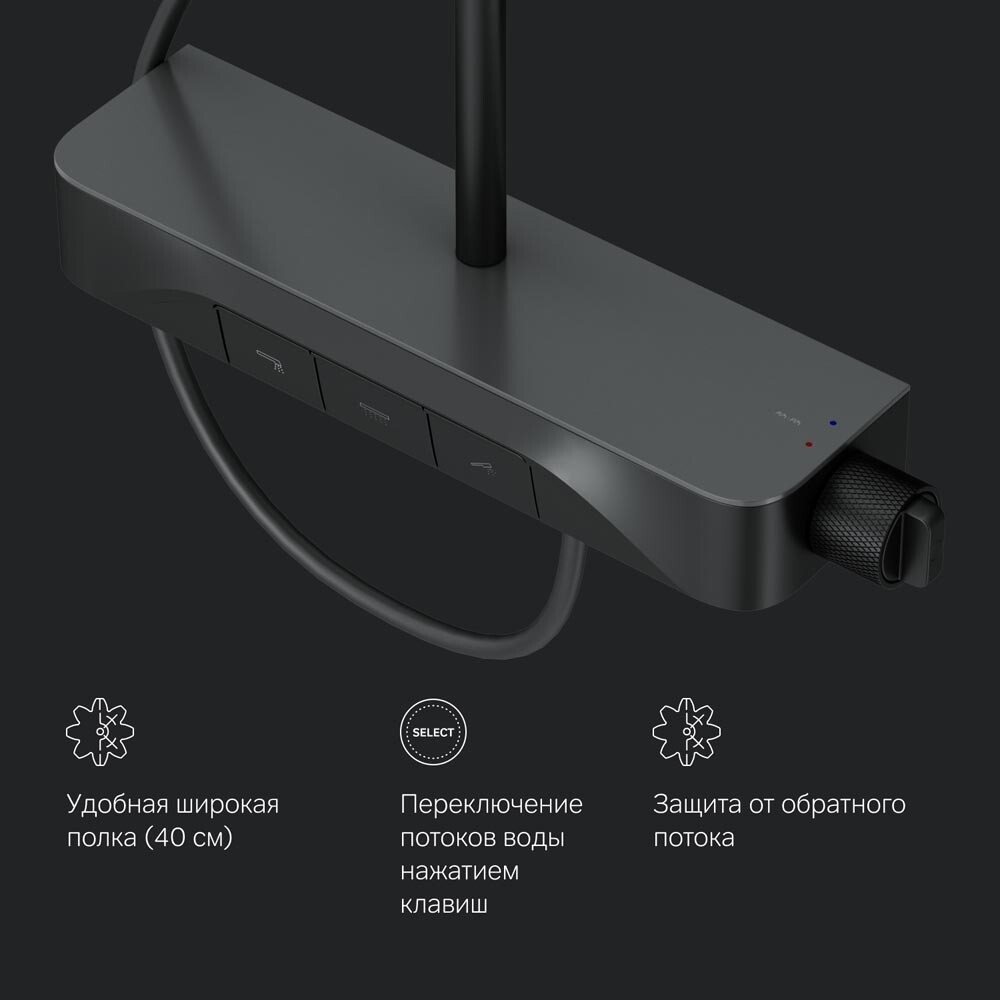 Смеситель выполнен в виде вместительной полочки. Внушительный размер полки (40 см) позволяет хранить все любимые средства под рукой, а эстетичный силуэт станет настоящим украшением современной ванной комнаты. Всего одна удобная ручка для настройки температуры и потока воды. Ручка дополнена инновационным антискользящим покрытием, которое позволяет комфортно управлять душевой системой даже с мыльными руками. Переключение потоков воды осуществляется нажатием клавиши. Телескопическая штанга регулируется по высоте, обеспечивая комфорт для людей любого роста. Трендовая прямоугольная форма, увеличенный размер леек и 3 режима ручного душа подарят ощущения настоящего домашнего SPA.