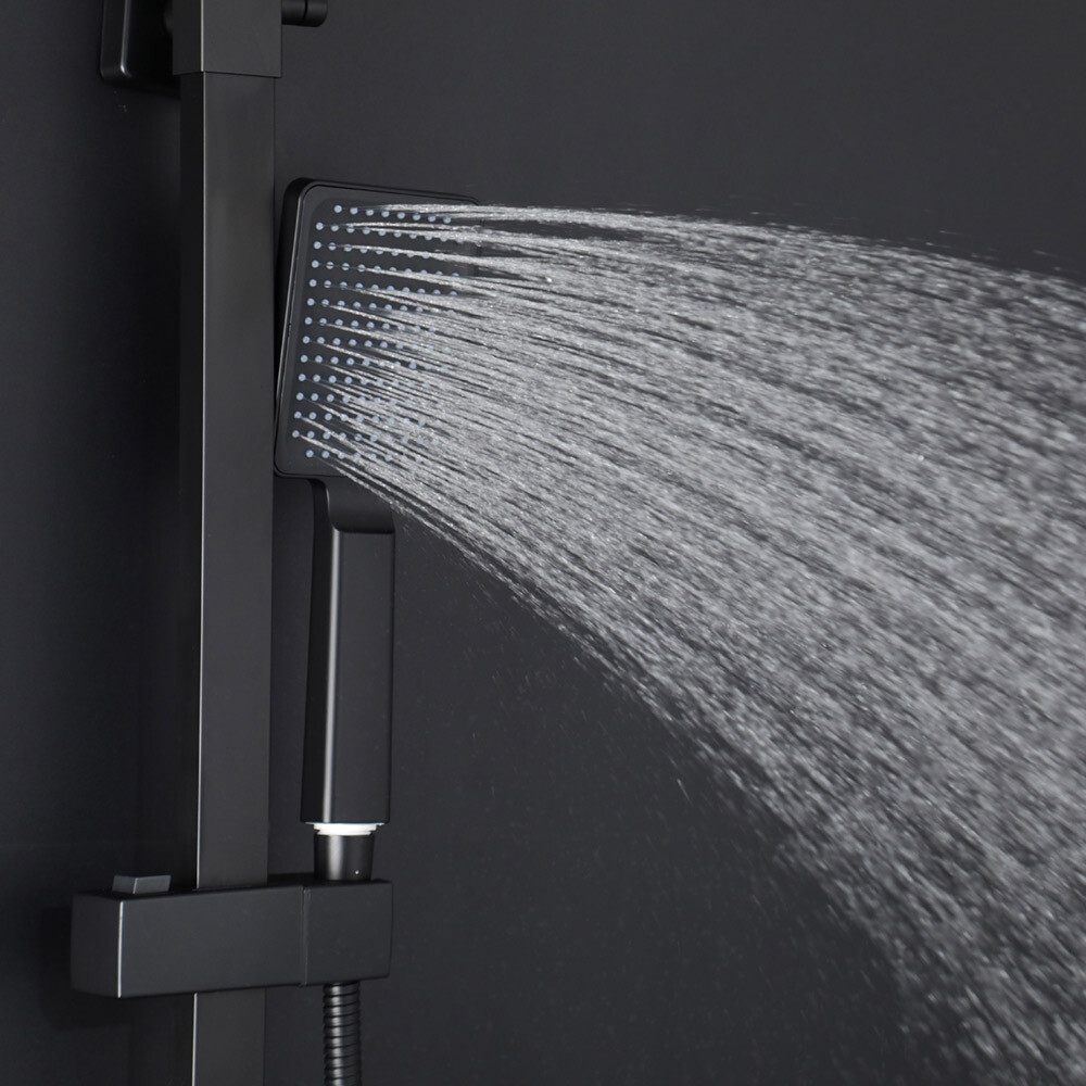 Душевая система с коротким изливом из нержавеющей стали в черном цвете. Смеситель оснащен керамический картриджем 35 мм и длинным поворотным изливом.