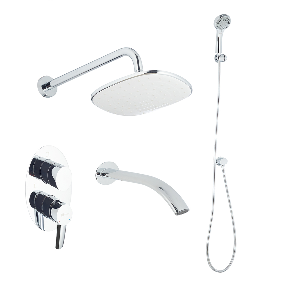 В комплектацию входит: смеситель встраиваемый с эко-картриджем d35 мм и металлической рукояткой — 1 шт, настенное поворотное крепление лейки — 1 шт, подключение для душевого шланга — 1 шт, 1-функциональная поворотная лейка верхнего душа 190×240 мм — 1 шт, 5-функциональная лейка D100 мм — 1 шт, встраиваемый излив 166 мм — 1 шт, шланг 2000 мм — 1 шт, паспорт паспорт изделия, гарантийный талон.