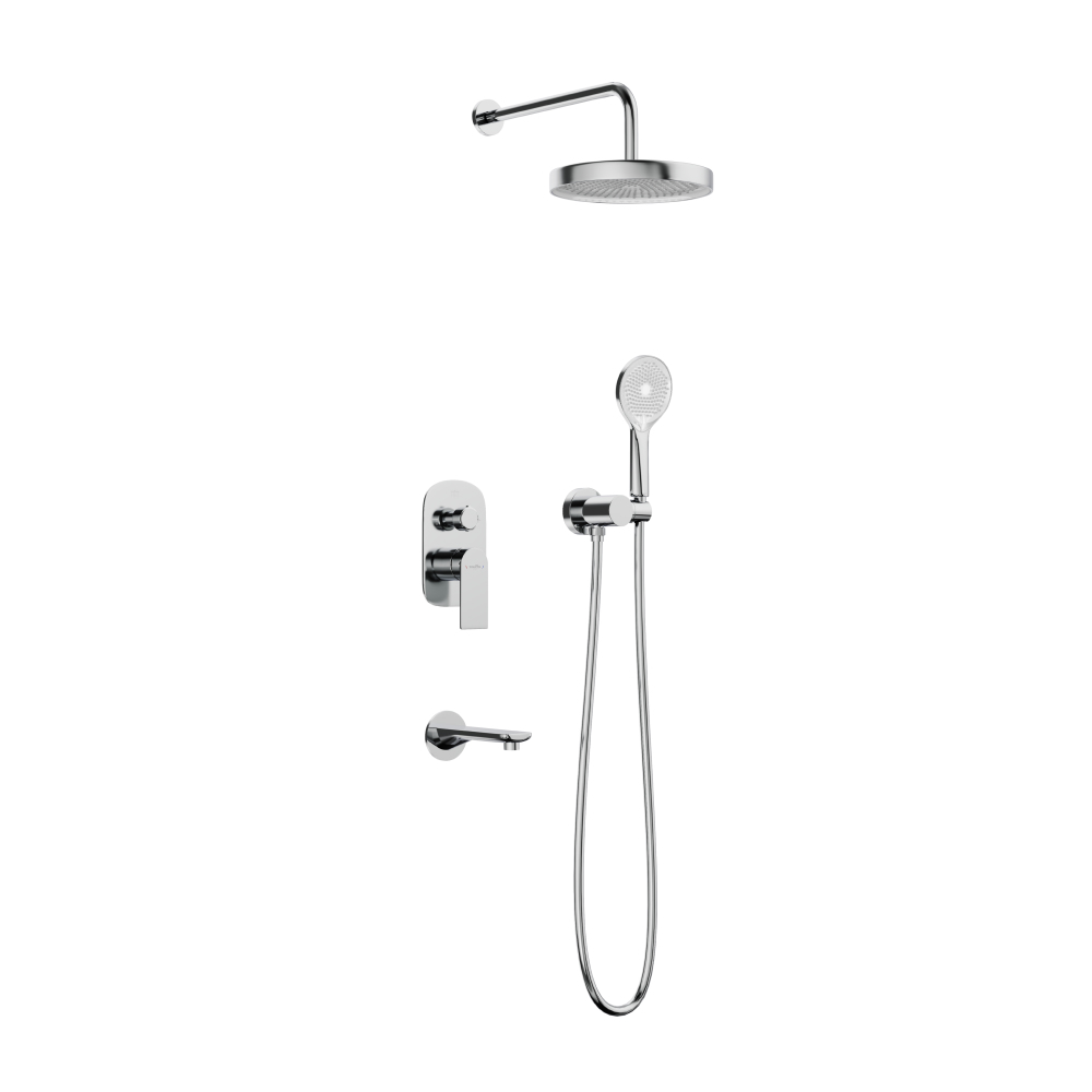 Комплектация: Смеситель, верхняя душевая лейка, кронштейн верхней лейки, ручная душевая лейка, душевой шлан 1,5 мг, держатель лейки с душевым подключением, излив.