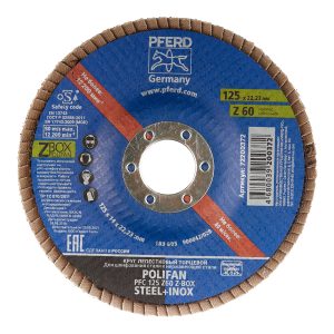 Первоначальная цена составляла 1423 ₽.1382 ₽Текущая цена: 1382 ₽.шт.Круг лепестковый по нержавеющей стали Pferd Z-BOX 125×22 мм P60 торцевой (72200372)