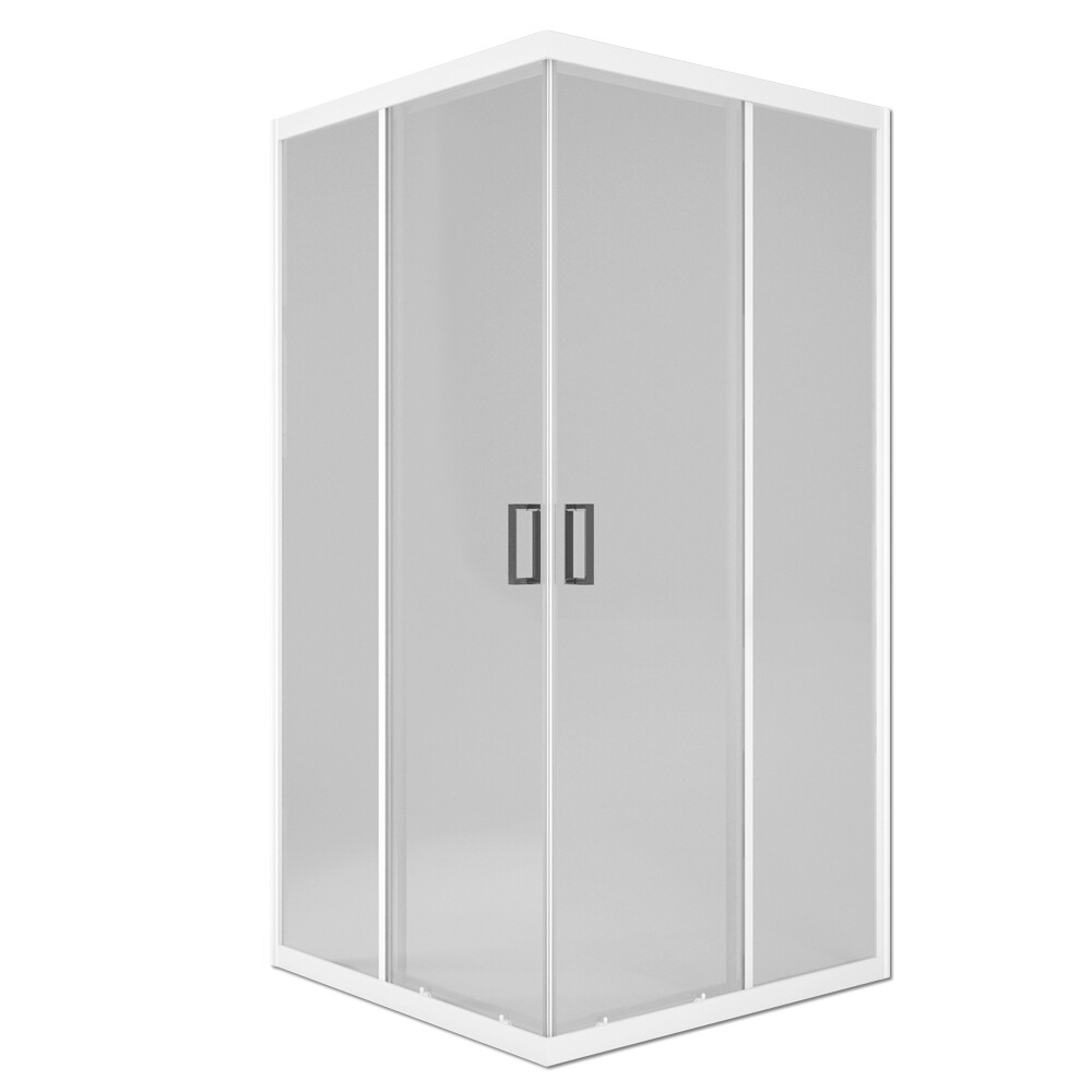 Душевое ограждение имеет квадратную форму. Оно выполнено из закаленного стекла толщиной 6 мм и алюминиевого профиля. Двери фиксируются магнитным смыканием. Ширина открытия проема 600 мм. Стоечный профиль обеспечивает сохранение геометрии (не дает прогнуться направляющим под весом дверей), снимает нагрузку со стекла и увеличивает общую жесткость. Установочный профиль дает возможность регулировки размера ограждения (+10 мм).