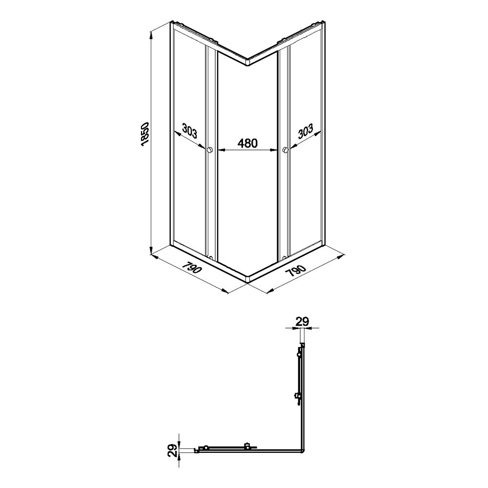 Душевое ограждение квадратной формы с двумя раздвижными дверцами.