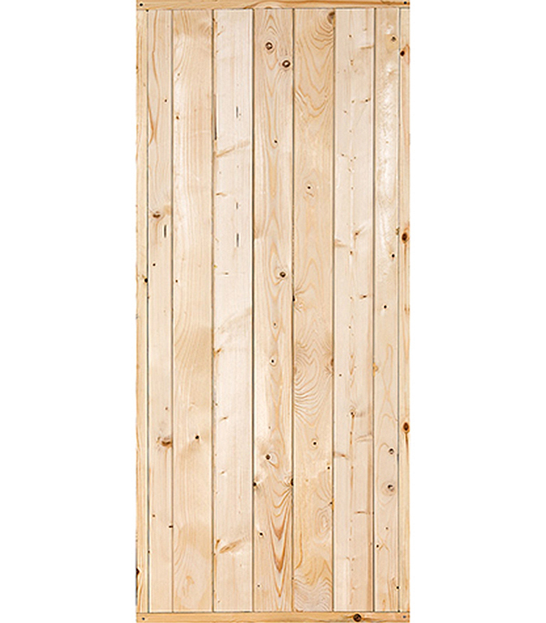 Дверное полотно гладкое, глухое, выполненное в виде вагонки (вертикальные строганные детали с фасками) из хвойных пород деревьев (сочетание ели и сосны), собранные в паз-гребень.