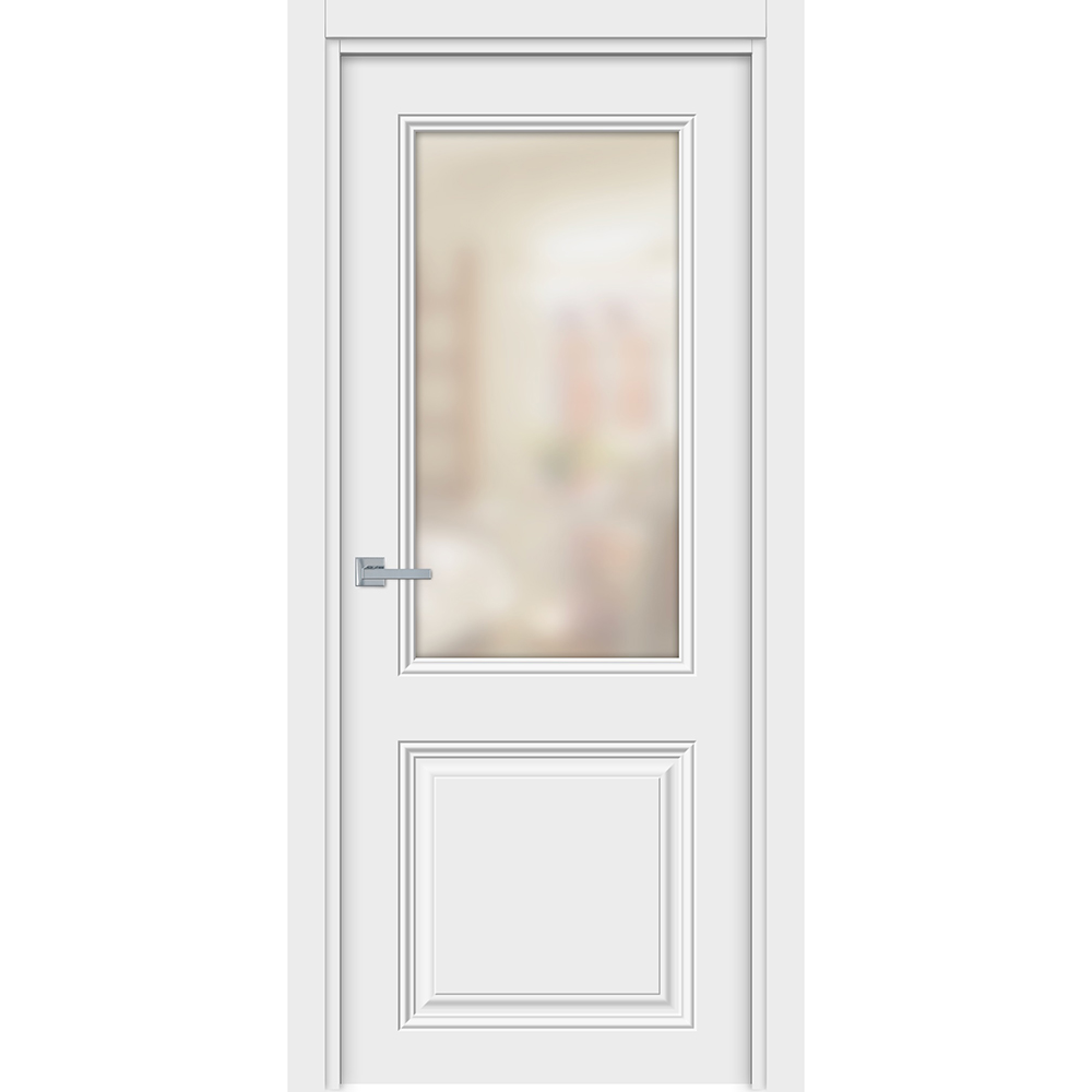 Дверное полотно остекленное. Каркас двери — горизонтальные перекладины и вертикальные стойки из МДФ (ДСП), наполнение — картонный сотовый заполнитель. Поверхность полотна — ДВП плита, покрытая финиш-пленкой.