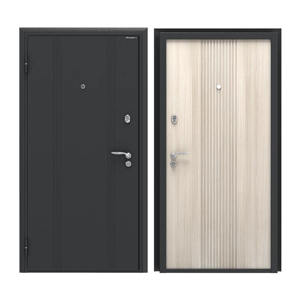 Входная дверь DoorHan Оптим предназначена для городских квартир. При качественных материалах в составе изделия и комплектующих, модель можно отнести к демократичному ценовому сегменту. Отличительная особенность — дверь полностью изготовлена из холоднокатаной оцинкованной стали с использованием технологии бесшовного производства с 2-мя листами металла, заполнение всего полотна огнестойкой минераловатной плитой высокой плотности. Снаружи стальной лист металла 0,8 мм с антивандальными свойствами Букле в темно-сером цвете, изнутри МДФ панель с ХДФ пленкой Рейн перламутр.