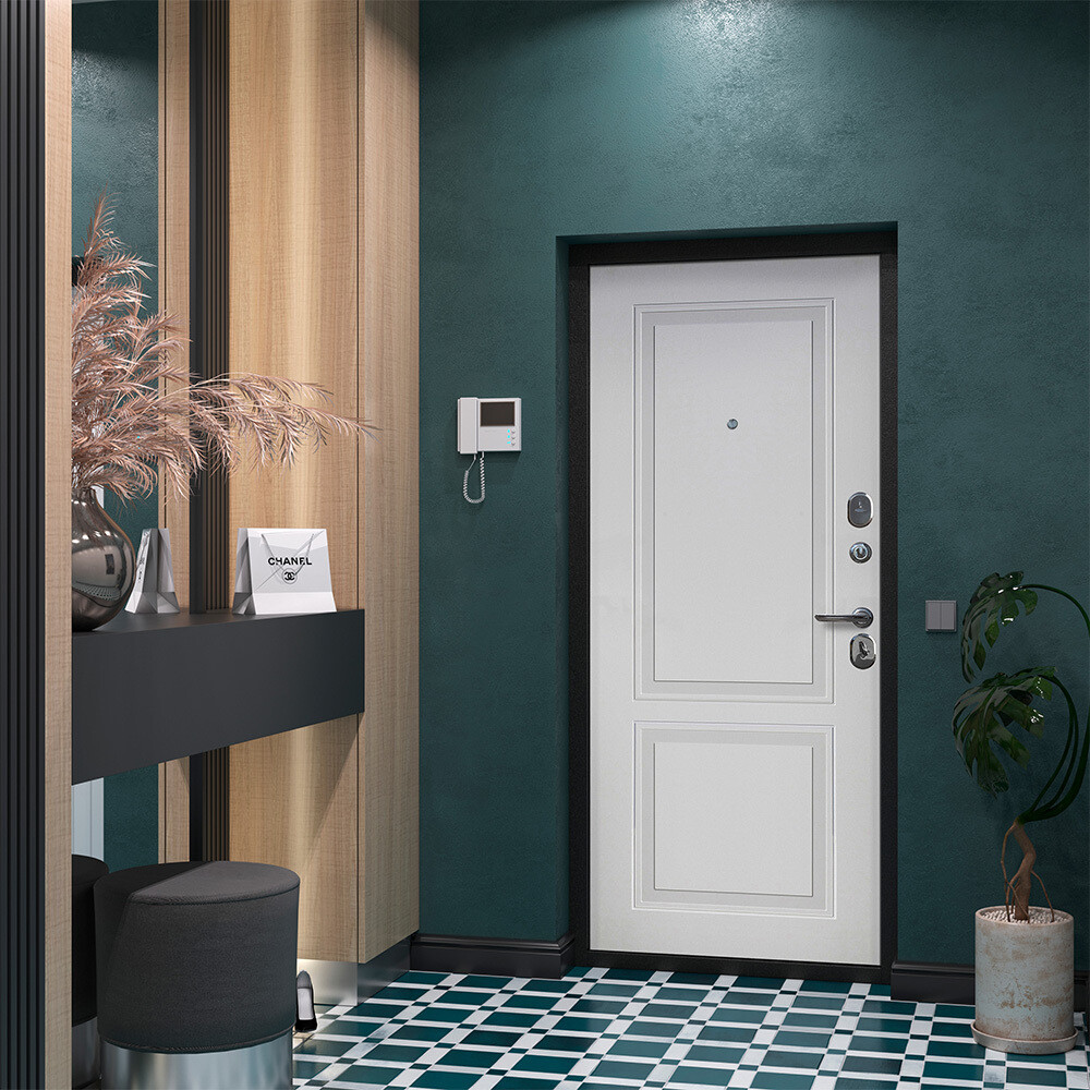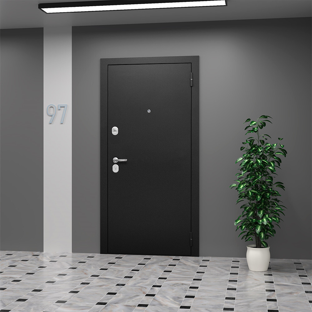 Предназначена для установки в жилых и общественных зданиях в качестве входной двери внутри помещения. Полотно изготовлено из стали. Стальной лист 0,8 мм с атмосферостойким порошковым покрытием цвета «Букле черный». С внутренней стороны облицовано фрезерованной МДФ-панелью толщиной 6 мм, цвет «Эмалит белый»; наполнение пенополистиролом.