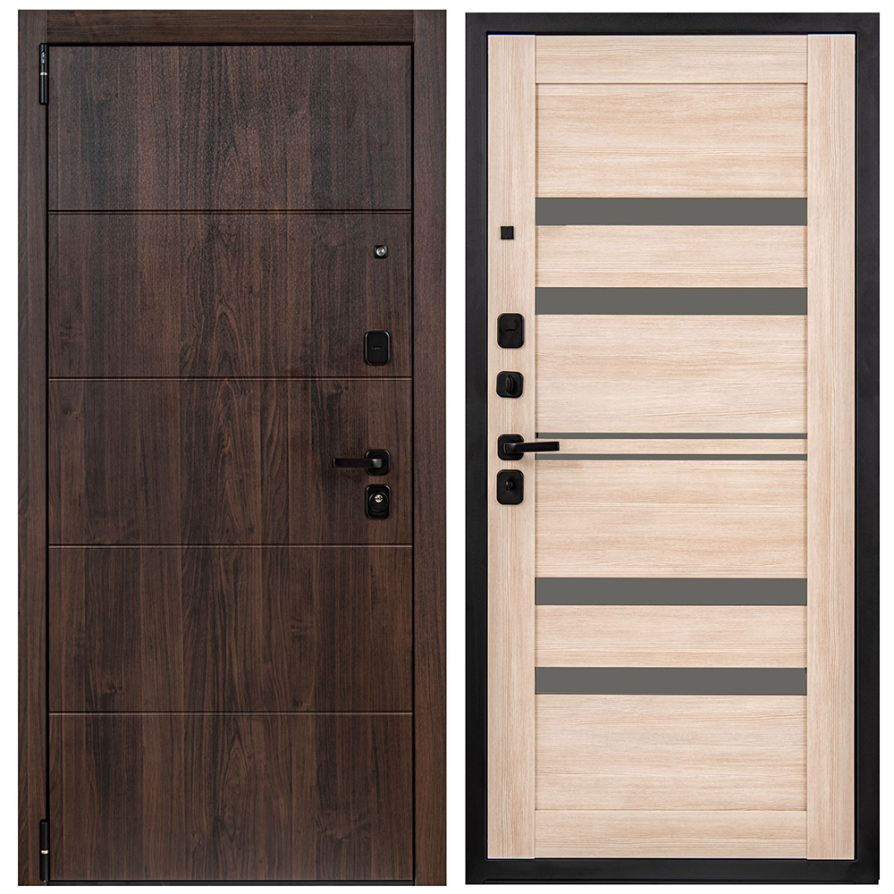 Дверной стальной однопольный блок с открыванием наружу. Дверь предназначена для установки в жилых и общественных зданиях в качестве входной двери внутри помещения. Цельногнутая конструкция полотна и закрытый цельнокатаный профиль коробки. Стальной лист с атмосферостойким порошковым покрытием цвет «Лунный камень» декорированный панелью МДФ 10 мм. С внутренней стороны облицовано царговой МДФ-панелью толщиной 22 мм, цвет «Cappuccino Veralinga». Три горизонтальных усиливающих омега-профиля (ребра) создают единую монолитную жесткость и прочность конструкции. Две наружные петли на опорных подшипниках. Два замка 4-го (высшего) класса взломостойкости. Цилиндровый механизм с вариантом исполнения «ключ-шток», взаимозаменяемый аналогичным вариантом. Встроенные в дверную коробку 3 гильзы из ABS-пластика обеспечивают тихую работу ригелей. Дверь крепится анкерными болтами (в комплект не входят и приобретаются отдельно) или с использованием монтажных пластин (6 шт. в комплекте).