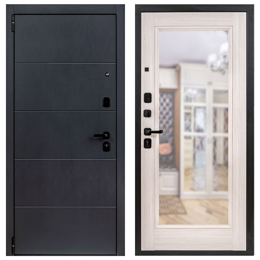 Дверной стальной однопольный блок с открыванием наружу. Дверь предназначена для установки в жилых и общественных зданиях в качестве входной двери внутри помещения. Цельногнутая конструкция полотна и закрытый цельнокатаный профиль коробки. Стальной лист с атмосферостойким порошковым покрытием цвет «Лунный камень» декорированный панелью МДФ 10 мм. С внутренней стороны облицовано царговой МДФ-панелью толщиной 22 мм, цвет «Bianco Veralinga» с зеркалом. Три горизонтальных усиливающих омега-профиля (ребра) создают единую монолитную жесткость и прочность конструкции. Две наружные петли на опорных подшипниках. Два замка 4-го (высшего) класса взломостойкости. Цилиндровый механизм с вариантом исполнения «ключ-шток», взаимозаменяемый аналогичным вариантом. Встроенные в дверную коробку 3 гильзы из ABS-пластика обеспечивают тихую работу ригелей. Дверь крепится анкерными болтами (в комплект не входят и приобретаются отдельно) или с использованием монтажных пластин (6 шт. в комплекте).