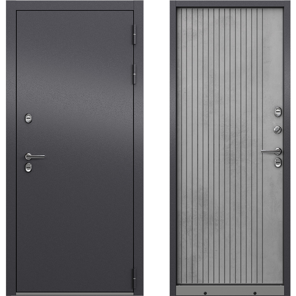 Предназначена для установки в качестве уличной входной двери в частных домах, загородных коттеджах, таунхаусах, на границе улица /дом, в том числе в жилых и общественных зданиях. Для дверей, имеющих контакт с улицей, обязательно наличие козырька, защищающего от прямых воздействий осадков и солнечного света. Конструкция двери одностворчатая, наружного открывания. Полотно изготовлено из стали. Стальной лист 1 мм с атмосферостойким порошковым покрытием цвета «Букле антрацит»; панель МДФ в цвете «Бетон серый». Наполнение — базальтовая плита + пенополистирол.