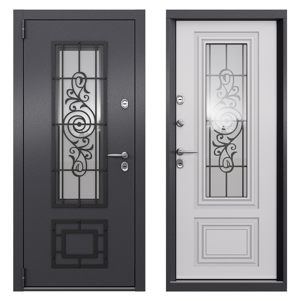 Наполнение полотна — пенополистирол + минеральная плита в ребрах жесткости с терморазрывом — фольгированный пенофол по периметру. Предназначена для установки в качестве уличной входной двери в частных домах, загородных коттеджах, таунхаусах, на границе улица/дом, в том числе в жилых и общественных зданиях. Для дверей, имеющих контакт с улицей, обязательно наличие козырька, защищающего от прямых воздействий осадков и солнечного света. Полотно изготовлено из стали, усиленное вертикальными ребрами жесткости со стеклопакетом и решеткой. Стальной лист с атмосферостойким порошковым покрытием цвета «Темно-серый букле графит»; панель МДФ в цвете КТ Белый». Короб — цельногнутый профиль закрытого типа с терморазрывом МДФ 6 мм.