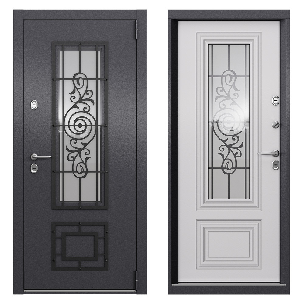 Наполнение полотна — пенополистирол + минеральная плита в ребрах жесткости с терморазрывом — фольгированный пенофол по периметру. Предназначена для установки в качестве уличной входной двери в частных домах, загородных коттеджах, таунхаусах, на границе улица/дом, в том числе в жилых и общественных зданиях. Для дверей, имеющих контакт с улицей, обязательно наличие козырька, защищающего от прямых воздействий осадков и солнечного света. Полотно изготовлено из стали, усиленное вертикальными ребрами жесткости со стеклопакетом и решеткой. Стальной лист с атмосферостойким порошковым покрытием цвета «Темно-серый букле графит»; панель МДФ в цвете КТ Белый». Короб — цельногнутый профиль закрытого типа с терморазрывом МДФ 6 мм.