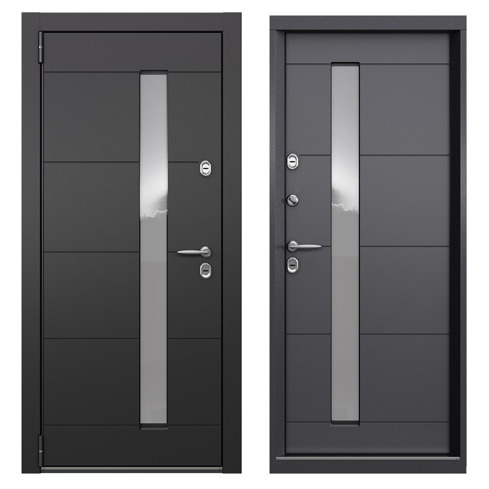 Наполнение полотна — пенополистирол + минеральная плита в ребрах жесткости с терморазрывом — фольгированный пенофол по периметру. Предназначена для установки в качестве уличной входной двери в частных домах, загородных коттеджах, таунхаусах, на границе улица/дом, в том числе в жилых и общественных зданиях. Для дверей, имеющих контакт с улицей, обязательно наличие козырька, защищающего от прямых воздействий осадков и солнечного света. Полотно изготовлено из стали, усиленное вертикальными ребрами жесткости со стеклопакетом. Стальной лист с атмосферостойким порошковым покрытием цвета «Темно-серый букле графит»; панель МДФ с ЛКП с внешней стороны в цвете «Графит», панель МДФ в цвете «Оскуро». Короб — цельногнутый профиль закрытого типа с терморазрывом МДФ 6 мм.