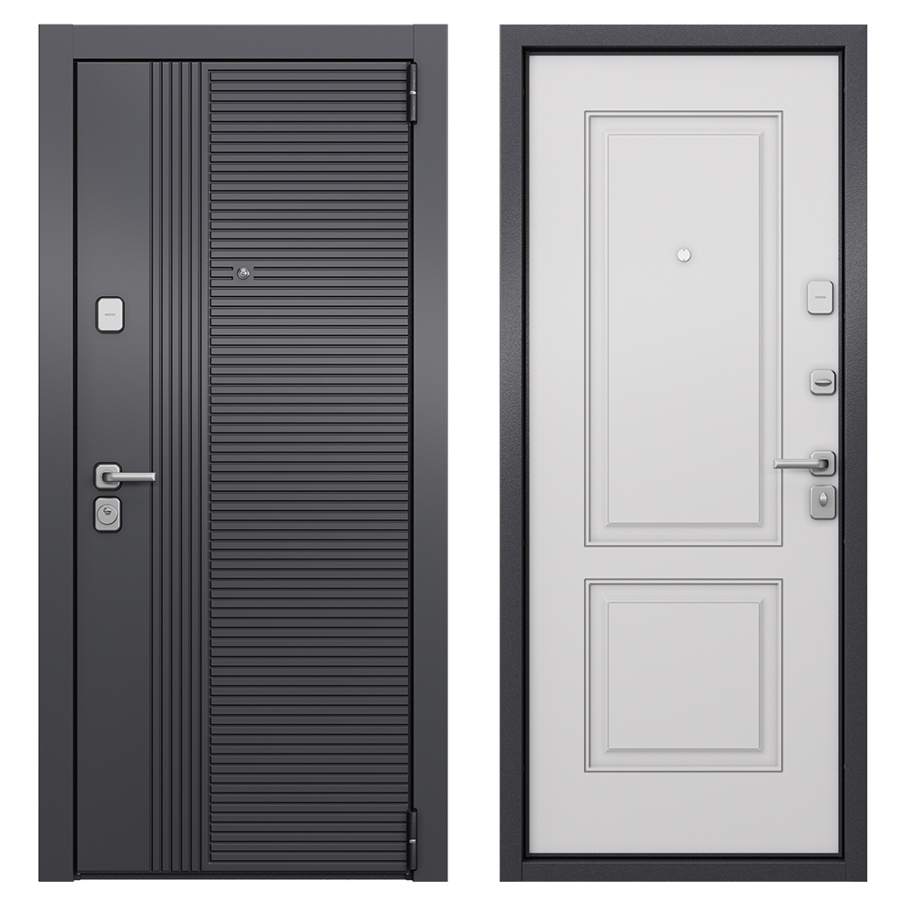Наполнение — минеральная плита высокой плотности + пенополистирол. Предназначена для установки в жилых и общественных зданиях в качестве входной двери внутри помещения. Полотно изготовлено из стали. Стальной лист 1,4 мм с атмосферостойким порошковым покрытием цвета «Темно-серый букле графит»; с внешней отделкой МДФ в цвете «Оскуро» с декоративной отделкой; с внутренней стороны МДФ в цвете «Бьянко».