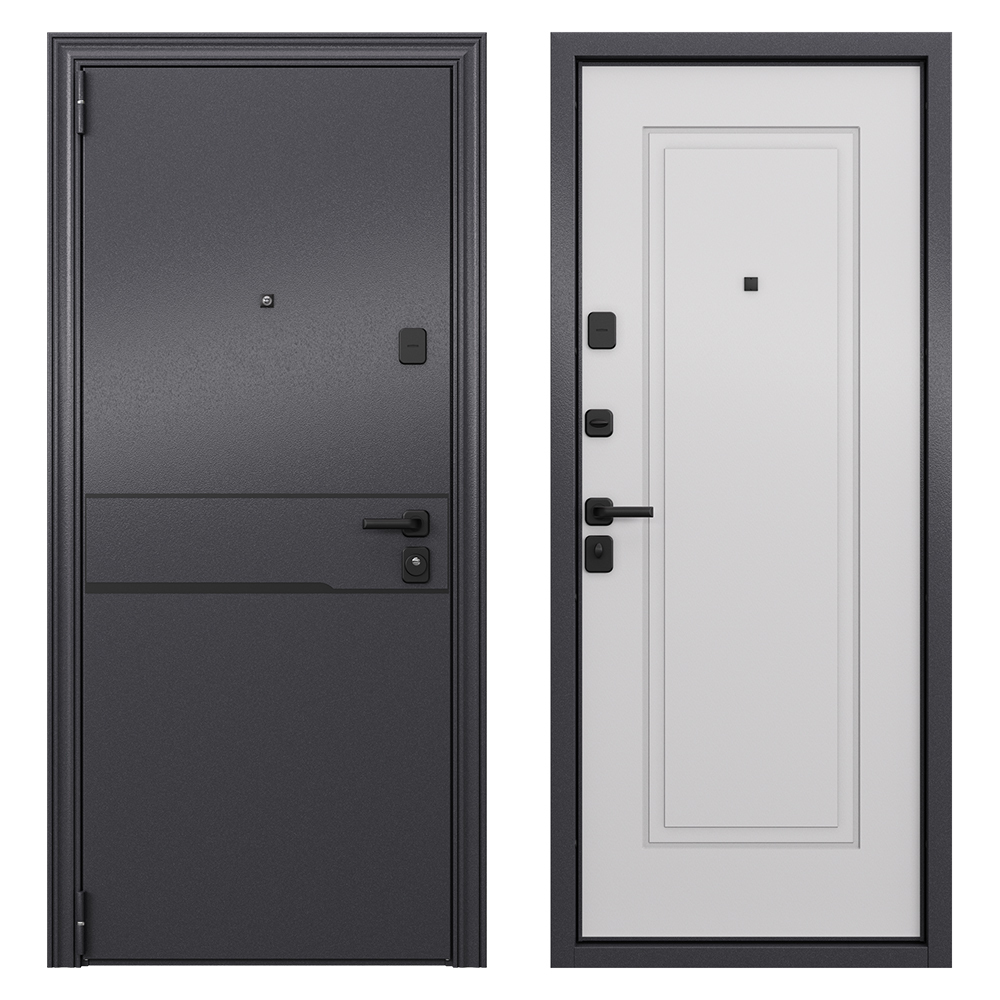 Наполнение — минеральная плита высокой плотности + пенополистирол. Предназначена для установки в жилых и общественных зданиях в качестве входной двери внутри помещения. Полотно изготовлено из стали. Стальной лист 1,4 мм с атмосферостойким порошковым покрытием цвета «Темно-серый букле графит»; с внутренней стороны МДФ в цвете «КТ Белый».