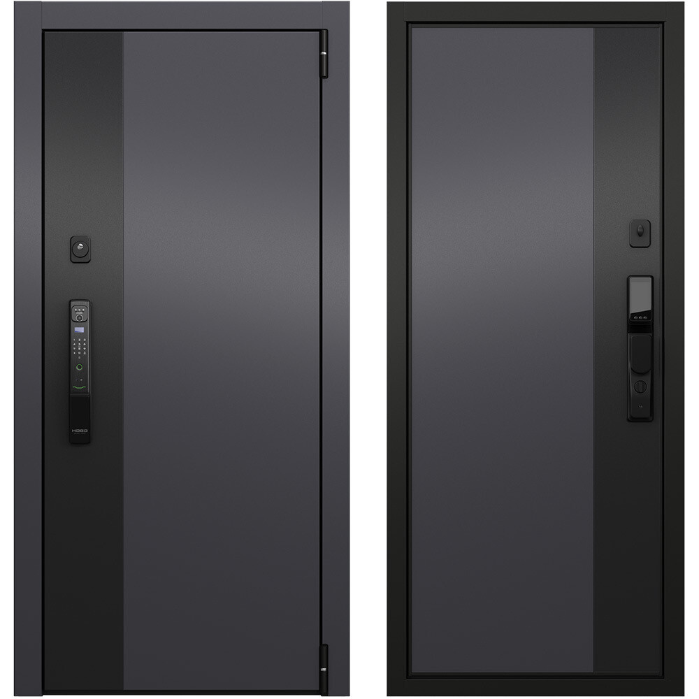 Предназначена для установки в жилых и общественных зданиях в качестве входной двери внутри помещения. Полотно изготовлено из стали. Стальной лист 1,4 мм с атмосферостойким порошковым покрытием цвета «Темно-серый букле графит»; с внешней отделкой МДФ в цвете «Оскуро + Черная шагрень» с декоративной отделкой; с внутренней стороны МДФ в цвете «Оскуро + Черная шагрень» с декоративной отделкой. Наполнение — пенополистирол+слой вибро- звукоизоляционного материала SGM. Дверь подразумевает установку электронного замка.