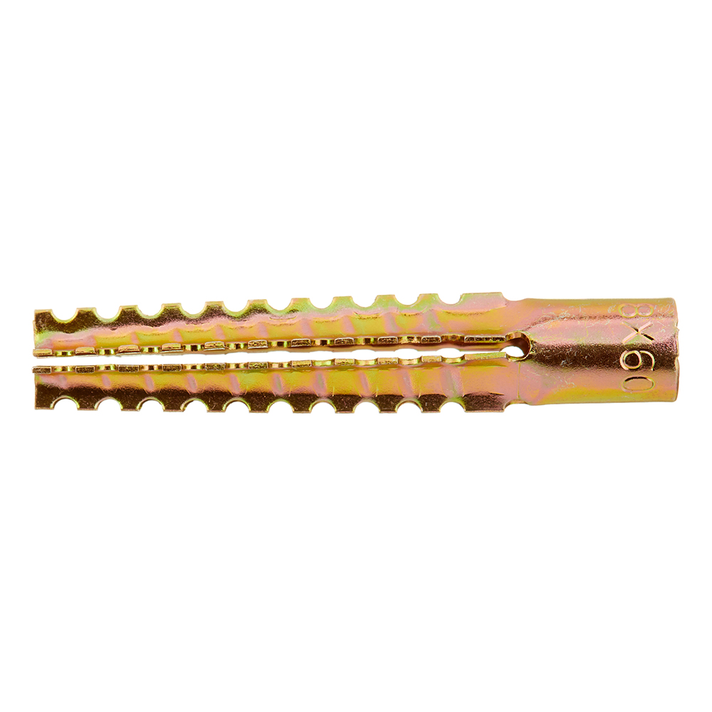 Предназначен для крепежа навесных конструкций к пористой поверхности стен. Конструкция дюбеля имеет 4-х сегментную распорную часть с внешними зубцами, благодаря которым обеспечивается высокая несущая способность в слабых видах основания. За счет острых зубцов дюбель не проворачивается в мягком материале основания при вкручивании в него крепежа. Дюбель выполнен из металла, поэтому его можно применять в пожароопасных зонах. Допускается устанавливать без предварительного сверления в газобетон низкой плотности. Применяются при установке дверей, окон, решеток, прокладке трубопроводов.