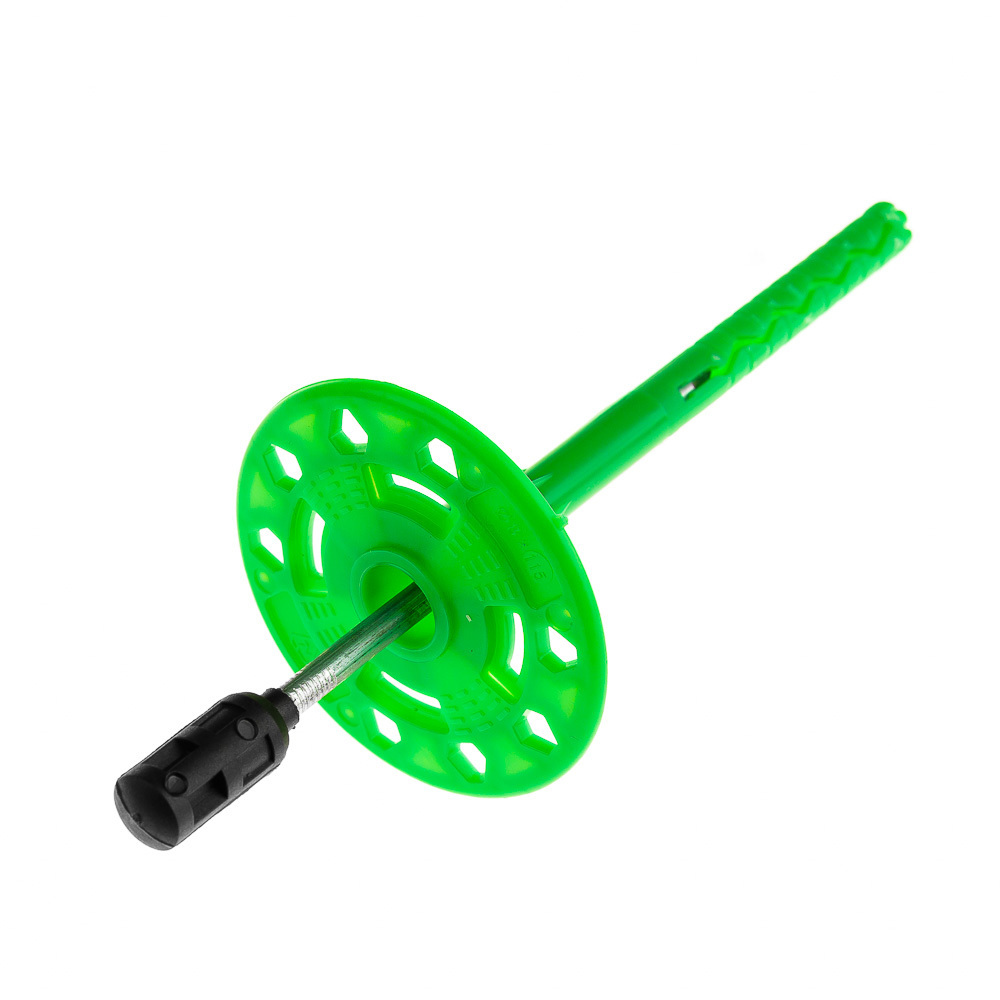 Фасадный полимерный тарельчатый дюбель, диаметром тарельчатого элемента 60 мм, со стальным гвоздем с термоизоляционной головкой длиной 22 мм, для крепления теплоизоляционных материалов к внутренним и наружным стенам в мало- и многоэтажном строительстве. Гвоздь из углеродистой̆ стали с антикоррозионным покрытием — прочный (выдерживает нагрузки до 750 кг на 1 кв. м.) и долговечный — применим для фиксации тяжелых утеплителей и накапливающих влагу материалов.
