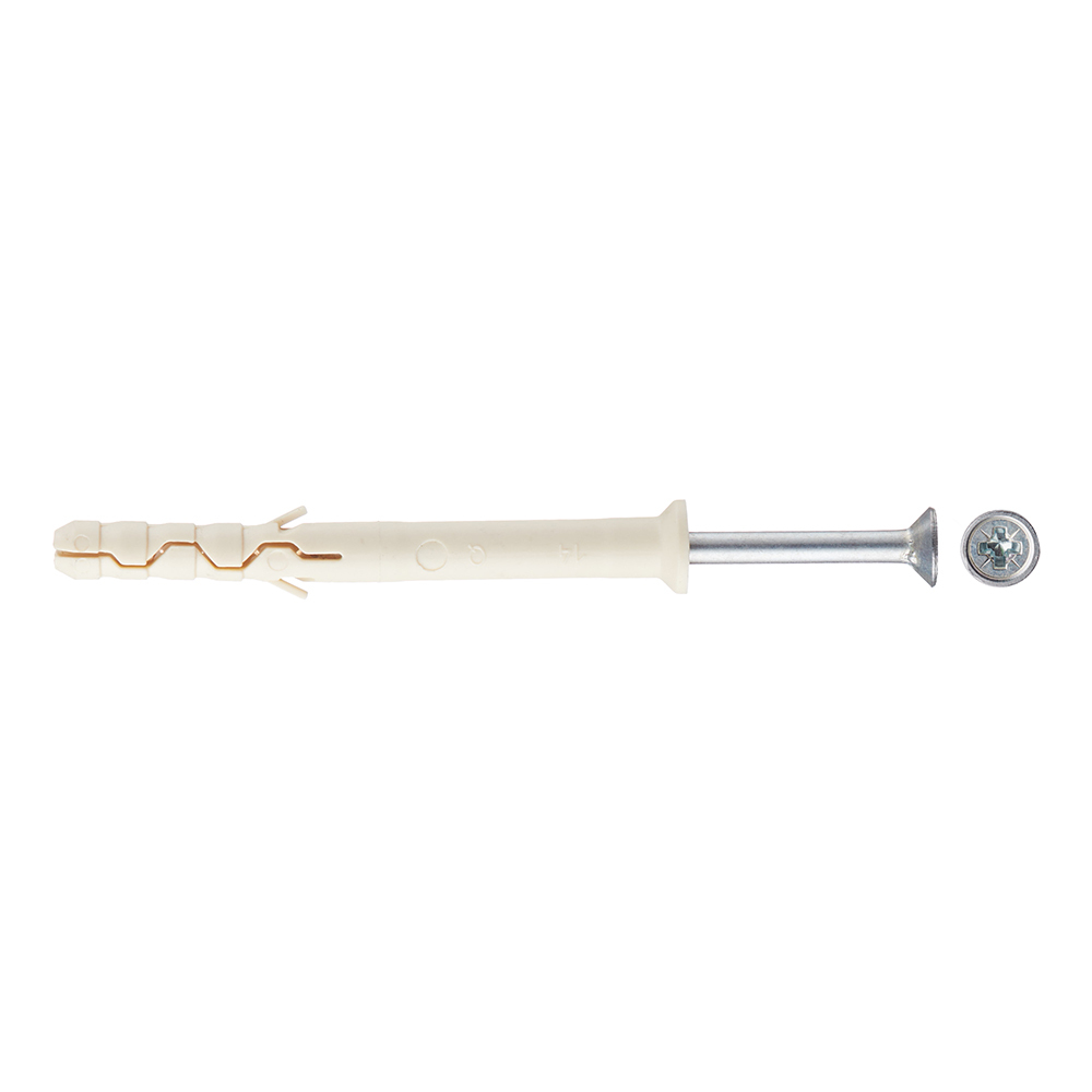 Дюбель-гвоздь предназначен для быстрого сквозного крепления различных конструкций в материал основания. В том числе направляющих гипсокартона, плинтусов, фанерного основания под паркетные полы, металлокаркаса. Надежное сцепление с материалом основания обеспечивается фиксирующими блоками на теле дюбеля. Геометрия внутреннего профиля центрирует шуруп при установке, обеспечивая равномерное раскрытие дюбеля.