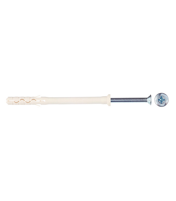 Нейлон обеспечивает надежное сцепление с материалом основания. Резьбовой оцинкованный гвоздь повышенной прочности заранее установлен в дюбель.
